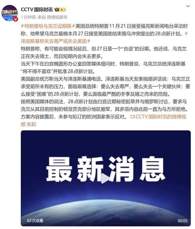 11月22日@央视国际新闻:美国总统特朗普11月21日接受福克斯新闻广播采访时表示,希望乌克兰接受美国提出的新28点计划,最迟在本月27日结束俄乌冲突。特朗普总统表示,根据情况可以推迟,但27日是“合适”的日期。他还表示,乌克兰正在失去领土,短期内还会失去更多领土。当天下午,特朗普总统在白宫椭圆形办公室回答媒体提问时表示,他需要乌克兰总统泽连斯基“点赞”并批准新的28点计划。同日,美国副总统万斯与泽连斯基通电话。泽连斯基总统当天在视频讲话中表示,“乌克兰面临着前所未有的压力,面临着艰难的选择:要么失去尊严,要么失去重要伙伴”。他们会接受新的“困难的”28点计划还是他们会面临最严酷的冬天以及随之而来的危险吗?据美国媒体报道,新的28点计划最近由白宫秘密起草,并与俄罗斯进行了讨论。呼吁乌克兰从目前控制下的顿涅茨克部分地区撤军。其大部分内容此前已被乌克兰拒绝。该计划内容一经曝光,未参与其制定的欧洲国家也纷纷表示反对。此前,据新华社报道,美国全国广播公司(NBC)19日晚间援引白宫官员的话报道称,美国总统特朗普本周批准了一项新的28点计划,旨在结束俄罗斯和乌克兰之间的冲突,以期恢复和谈。除了美国中东问题特使维特科夫之外,美国副总统居民万斯、国务卿卢比奥和特朗普的女婿库什纳也参与了该计划的制定,该计划的重点是“提供报道援引未透露姓名的白宫官员的话说。白宫官员没有提供该计划的具体细节,称仍然有必要与有关各方进行谈判。19日晚,卢比奥在社交媒体上发文称,美国正在考虑俄罗斯和乌克兰的意见,继续制定结束俄罗斯和乌克兰冲突的“可能想法清单”。他强调,结束俄罗斯和乌克兰之间的冲突“需要困难但必要”特朗普、泽伦斯基和普京的照片马赛克。中国视觉资料图 美国军方19日发表声明称,陆军部长德里斯科尔及其代表团将于当天抵达乌克兰首都基辅,与乌克兰官员会面,讨论结束冲突的努力。美国多家媒体19日报道,维特科夫率领美军他起草了新计划,并与俄罗斯总统特别代表德米特里耶夫进行了详细会谈,但乌克兰没有参加。最先披露该计划的美国新闻网站Axios 19日晚报道称,新计划要求乌克兰放弃“更多领土”“以换取美国保证乌克兰和欧洲未来不会被俄罗斯入侵”。报道援引美国官员的话说,白宫认为,如果俄乌冲突继续下去,乌克兰最终可能会失去这些领土。 “因此,现在达成协议符合乌克兰的利益。”据《华盛顿邮报》援引匿名消息人士的话报道,除了领土要求外,新计划还要求将乌克兰军队规模减半。据报道,美国正在就新计划向乌克兰总统泽连斯基施加压力。由于战争,政治局势对于乌克兰局势和巨大的腐败丑闻,泽连斯基“可能别无选择”。当地时间11月20日,美国新闻网络Axios公布了美国政府为结束俄罗斯和乌克兰冲突而起草的新28点计划的全部内容。关键点包括俄罗斯、乌克兰和欧洲之间缔结互不侵犯条约,乌克兰承诺不加入北约,克里米亚、卢甘斯克和顿涅茨克地区将被视为事实上的俄罗斯领土,以及赫尔松和扎波罗热控制的地区将沿目前的接触线被冻结。据报道,该计划得到了美国和乌克兰官员的确认。美国敦促乌克兰在“紧迫的时间内”达成协议。然而,该计划是一份“动态文件”,将根据各利益相关方的意见进行修改。编辑:十月内编:陈静 【来源:央视国际新闻、新华社】声明:版权所有本文版权归原作者所有。如果信息来源不正确或存在侵犯您的权利和合法利益的情况,请通过电子邮件与我们联系,我们会及时给您回复。邮箱地址: