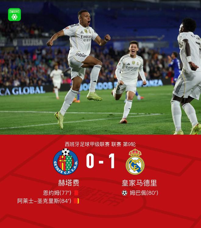 北京时间10月20日凌晨3点,西甲联赛第九轮继续进行。皇家马德里客场挑战赫塔菲。裁判是何塞·穆努埃拉。姆巴佩和阿拉巴上半场的进球制造了危险。下半场,尼约姆替补上场,以闪电般的速度超越了维尼修斯。随后姆巴佩凭借进球获胜。圣克里斯脚踢维尼修斯领到第二张黄牌后被罚下场。最终,皇马1-0击败九人组成的赫塔菲。关键时刻:尼约姆在第77分钟替补上场,赫塔菲少了一名球员。第80分钟,姆巴佩接古勒直塞,射门破门。皇马1-0破平!第84分钟,圣克里斯领到第二张黄牌被罚下场。在赫塔菲的九人比赛中,两支球队的球员都上场了。战斗即将开始。裁判吹响了比赛开始的哨声。两队球员均保持沉默以抗议违规行为作为匹配。第8分钟,姆巴佩突入禁区射门。球被救了。第10分钟,姆巴佩侵入禁区。远射,球飞向门柱。第22分钟,赫塔菲球员对禁区内巴尔韦德犯规提出抗议,但裁判没有理睬。第31分钟,姆巴佩远射,皮球被没收。第36分钟,图梅尼远射,皮球高出横梁。第40分钟,圣克里斯图尔抽射拿下两分。球没有击中门柱。第42分钟,马斯坦诺在攻击区内倒地。随后罗德里戈尝试从某个角度射门,但被挡出。第45分钟,阿拉巴对门犯规,但皮球被停。第45+3分钟,马斯坦诺横向抽射打门,发射高射炮。马斯坦德诺和维尼修斯在第55分钟被换下。第65分钟,贝林汉姆直传,姆巴佩追赶但没打中。第72分钟,Mb阿佩尝试任意球射门,但皮球偏出。第90+5分钟,图梅尼踩人犯规吃到黄牌。第90+6分钟,赫塔菲最后时刻获得机会,但被挡出。卢图瓦前来救援。球队阵容技术统计