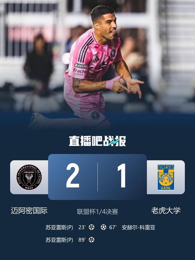 8月21日直播。8月21日,联赛杯的四分之一决赛对阵老虎队对阵北京时代,迈阿密国际国际队在洛克哈特体育场举行。梅西缺席了这场比赛。阿尔巴(Alba)在上半场创造了积分,苏亚雷斯(Suarez)取得了第一杆的成绩,并取得了纪录,阿伦德(Arende)以1-0迈阿密国际队(Miami International)1-0的1-0老虎队以1-1结束了进球。在下半场,阿尔巴(Alba)退出了受伤,雷恩斯(Renes)以遥远的可能性到达了职位,科雷亚(Correa)打进了一个进球以匹配得分,创造了一个进球,苏亚雷斯(Suarez)攻入了另一个进球,最后迈阿密国际(Miami International)2-1的老虎队2-1晋升为半决赛。关键比赛:迈阿密国际队在第19分钟赢得了点球!阿尔巴从左侧的末端越过十字架,为剃须刀的手鼓掌,裁判予以罚款。苏亚雷斯(Suarez)进行了刑事射击,并赢得了迈阿密国际内部技术的国际大学。 ↓在第66分钟,大学老虎的优点与其分数相匹配!科雷亚超过了前法庭,进入罚球区,并为迈阿密国际1-1老虎队获得了个人机会。 ↓在第84分钟,迈阿密国际赢得了另一次点球! DePaul在罚球区接球,并用裁判的手击中Chaville。重复进行了VAR后,批准了犯罪分子,苏亚雷斯(Suarez)赢得了迈阿密国际(Miami International)2-1的老虎大学。 ↓焦点游戏时刻:由于受伤,相机将使梅西缺席。 ↓在第27分钟,苏亚雷斯(Suarez)穿过中心,搬到了罚球区,在那儿,阿伦德(Arende)以防守球员的身分获得了1-1的机会。 ↓在第34分钟,阿尔巴突然从中心开火。 ↓在第44分钟,阿尔巴摔倒在地,团队医生到达野外治疗。 ↓上半场4分钟的停止时间,迈阿密国际1-0老虎大学下半场改变了一侧,在第46分钟的阿尔巴受伤,无法抓住我T,因此被替换。 ↓在第48分钟,Maschelano对裁判的罚款不满意,并用红牌送往看台。 ↓56分钟,迈阿密将球清除了离后面不远的球,雷恩斯在右边射出并跳了起来。 ↓在第74分钟,科雷亚从禁区的右侧直接通过,转身拍照,但乌斯塔利救了他。 ↓下半年停止时间的6分钟。在第90分钟,科雷亚从罚球点附近的罚球区移至罚球区。雷恩斯朝球向球发射,两侧发射了柱子。 ↓迈阿密国际2-1老虎大学,年底。双方的首次启动和替代信息: